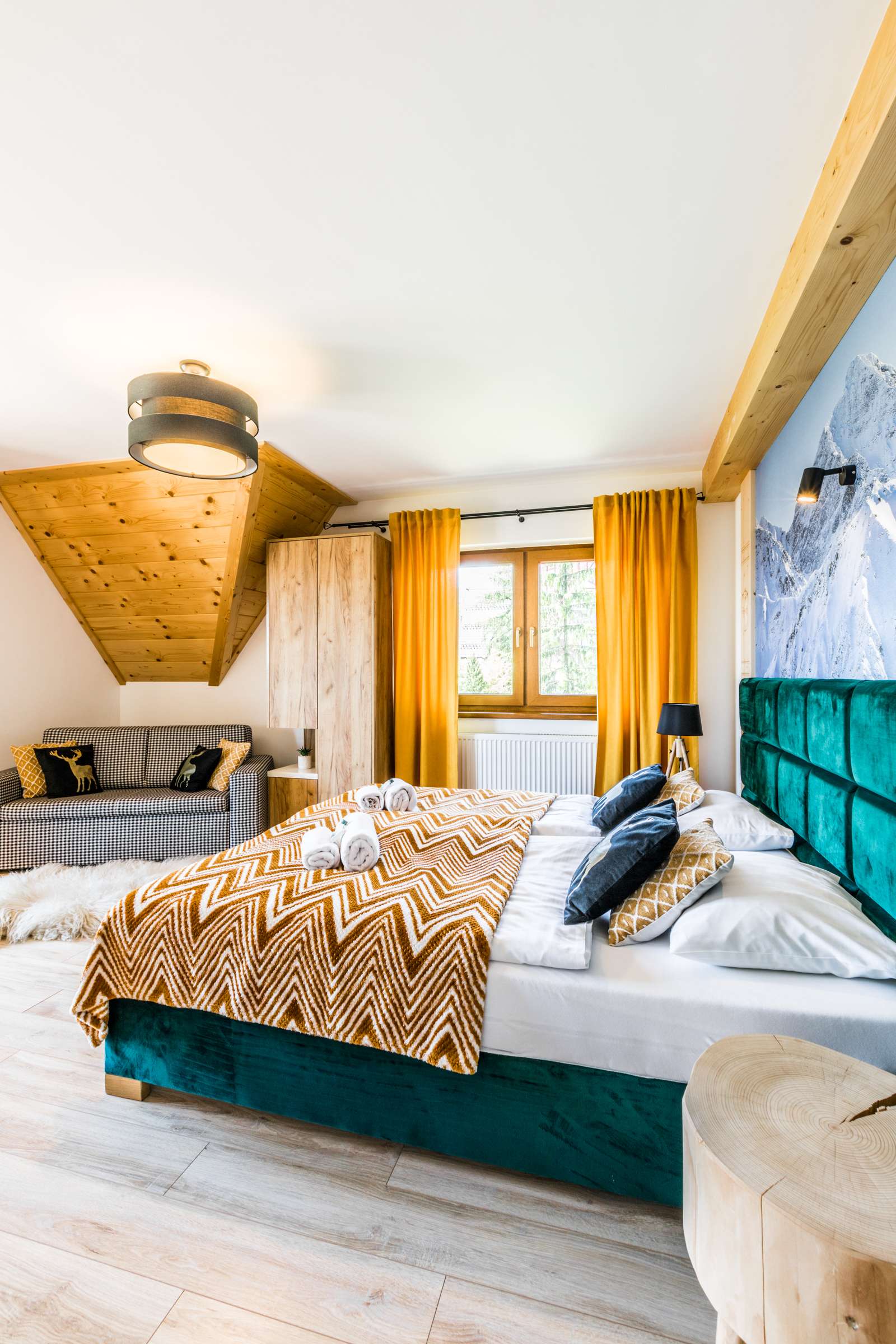 Pokój z balkonem z pięknym widokiem na panoramę Tatr. W pokoju znajduje się jedno duże podwójne łóżko o wymiarach 180/200 oraz wygodna rozkładana kanapa 140/200 , która pomieści dwie osoby, jest też możliwość przygotowania dwóch pojedynczych łóżek o wymiarach 90/200 zamiast jednego dużego. Możemy na życzenie Gości przygotować łóżeczko dla maluszka - bezpłatnie. W pokoju znajdują się również inne niezbędne meble takie jak: szafa, stolik, krzesła, stoliki nocne oraz TV. Pokój posiada nowoczesną łazienkę z prysznicem ,umywalką, ubikacją i niezbędnym wyposażeniem oraz suszarką, każdy z Gości otrzymuje ręczniki oraz mini kosmetyki. Na balkonie znajdują się meble do wypoczynku.